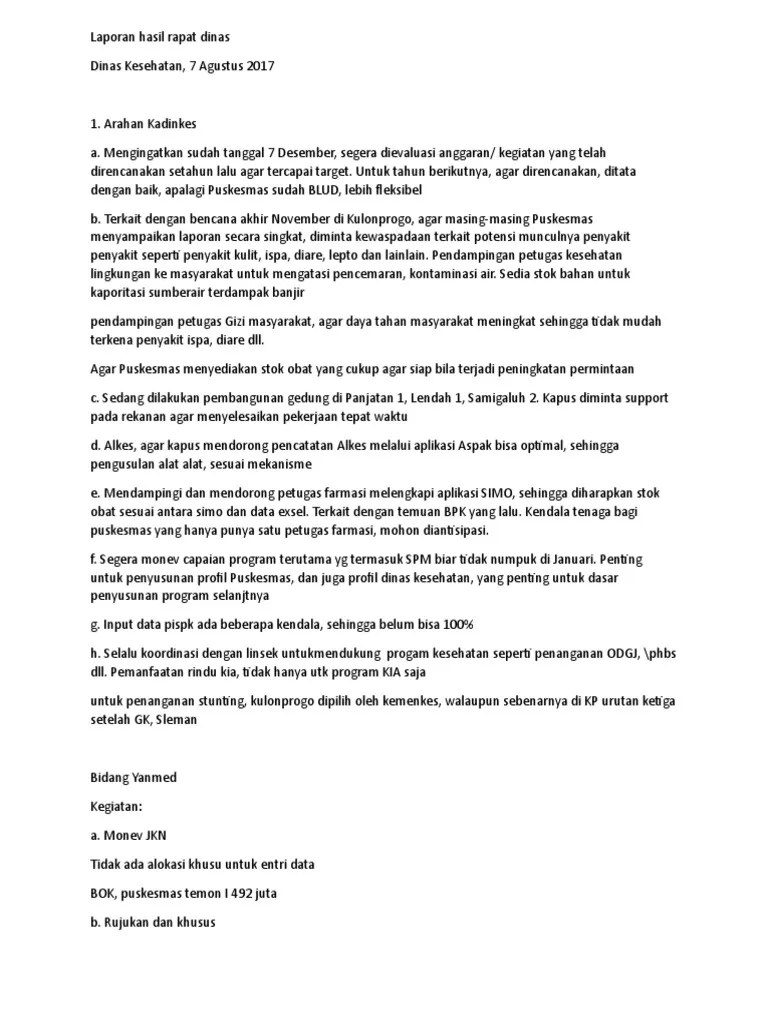 Dec 10, 2020 · format notulen rapat merupakan suatu catatan rinci yang mencakup keseluruhan inti atau simpulan dari hasil rapat. Hasil pembahasan dari rapat juga sudah dijelaskan dengan cukup detail sehingga peserta rapat bisa segera melakukan tugasnya. Ini juga akan berfungsi sebagai garis besar saat anda menulis notulen. Feb 22, 2021 · contoh laporan hasil rapat kerja demikian tulisan mengenai beberapa contoh notulen rapat terlengkap yang bisa kami sajikan. See full list on star4hire.com